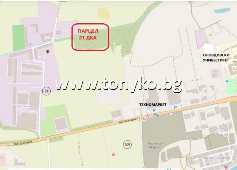 Реф. 631347;'ТОНИКО имоти' предлага срещу ОБЕЗЩЕТЕНИЕ парцел от 21 дка в район 'Северен'. Имотът се намира зад новата сграда на Пловдивски университет 'Паисий Хилендарски' и зад магазин Техномаркет. Отстои на 600 метра от булевард 'България'. Има лице 260 м на вътрешен път. Съгласно Общия устройствен план теренът попада в устройствена зона 'Жс' за средно жилищно застрояване с показатели: Кинт до 2, Плътност на застрояване до 70 %. Трафопост и водопровод има в непосредствена близост. За контакт: Антоанета Ненова 0898 613 555