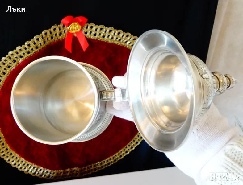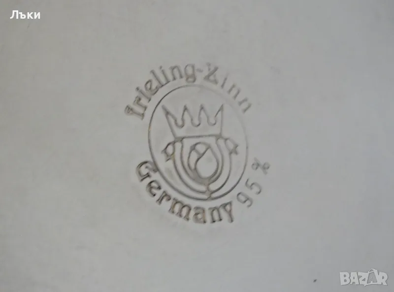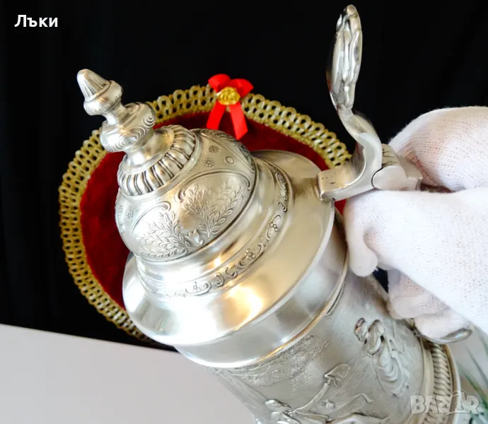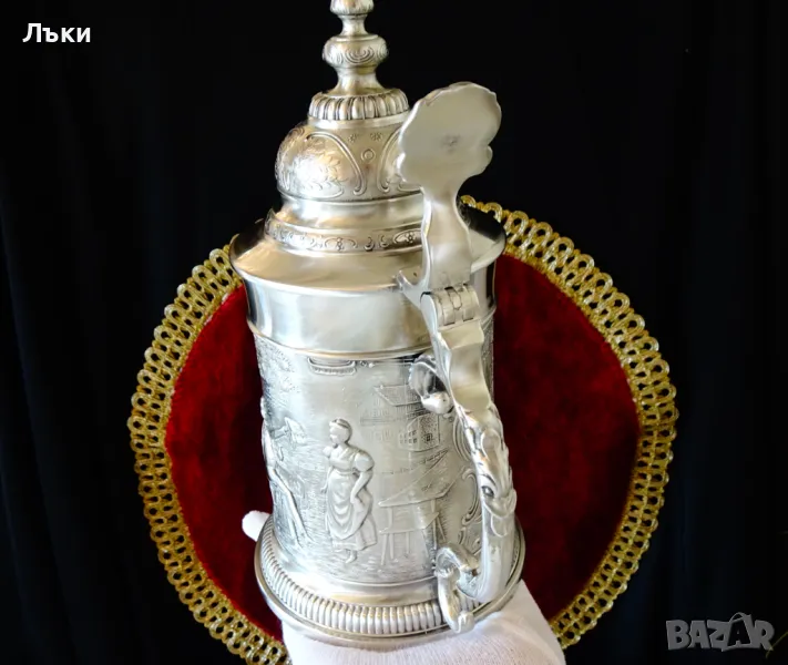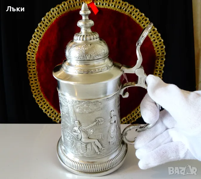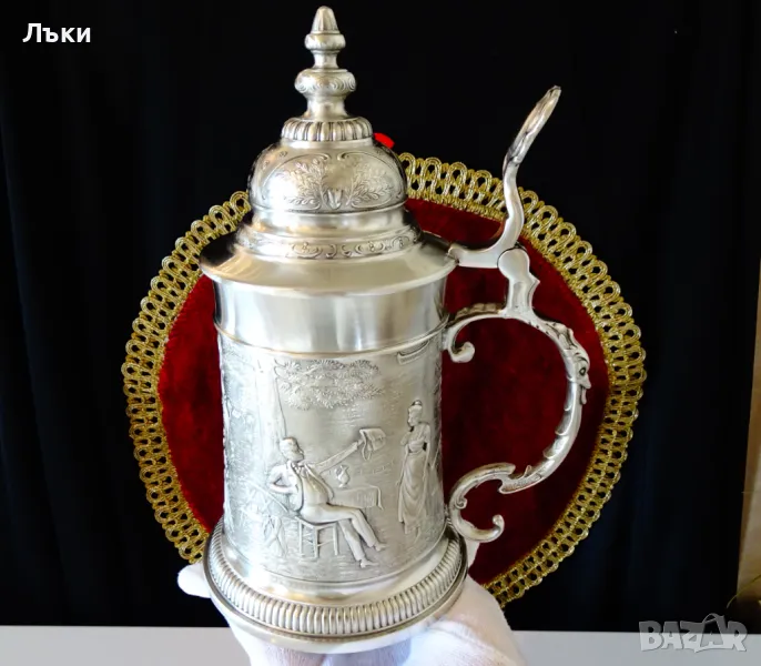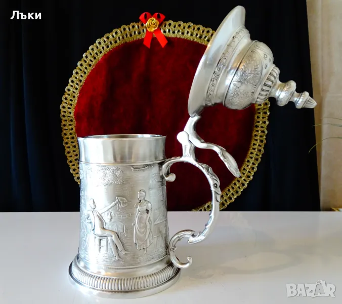 95% калай и 5% сребро, маркирана и със знак за високо качество.Халбата има прецизно изваяна релефна картина по любовната народна песен ”Die Lindenwirtin” - „Нито една капка в чашата”.Песента е посветена на емблематична кръчма „Gasthof zum Godesberg” в Бад Годесберг с красива 18