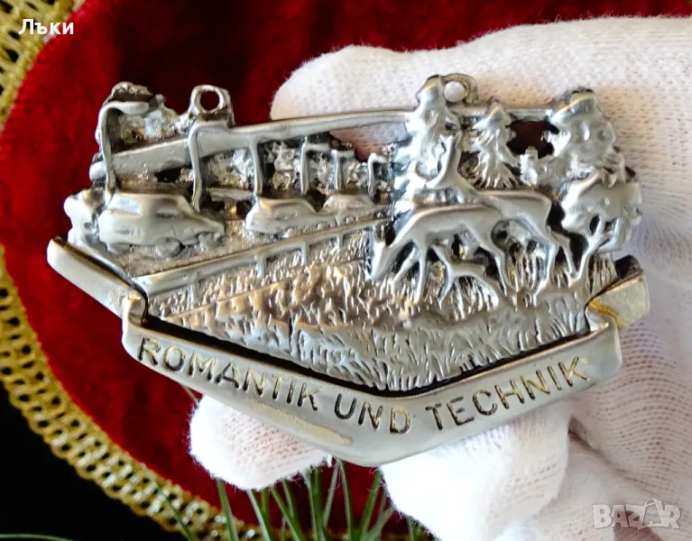 от масивен калай.Представени са романтиката на природата – стадо елени до борова гора и магистрала с автомобили,като символ на техниката,разделени от мантинела.Има две окачалки.Размер 8 х 5.5 х 0.9 см.Тегло 115 гр.