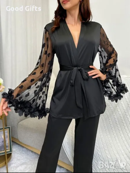 Насладете се на несравнимата елегантност и комфорт с луксозния сатенен комплект от халат и панталон. Този продукт осигурява идеалния баланс между стил и удобство, спечелвайки вашето внимание с изчистените си линии и романтичните дантелени ръкави. Изработен от изключително нежна 100% полиестерна материя, халатът е създаден да бъде лек, дишащ и приятно усещащ се върху кожата.