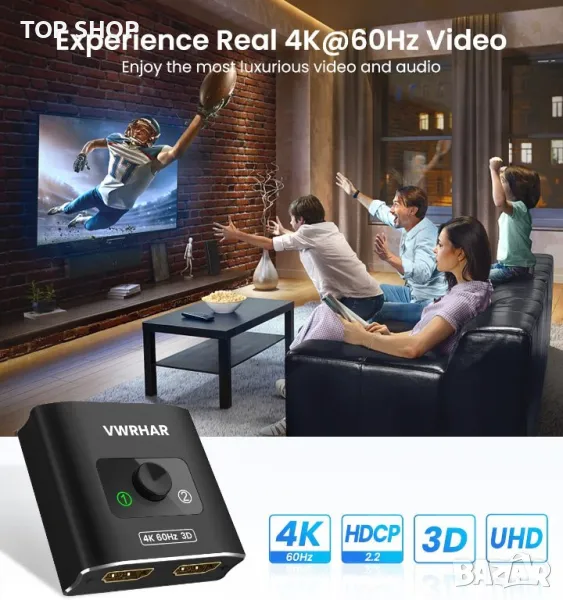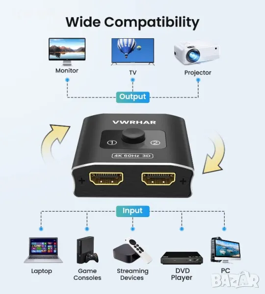 Chromecast, Firestick, кабелна кутия, Apple TV, компютър и др. Изход: HD-Ready, Full HD, UHD телевизори, монитори, проектори и др.