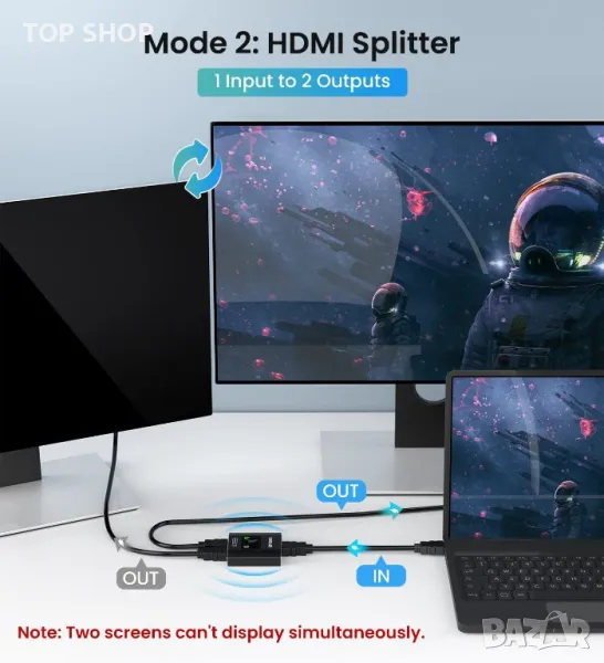 【Двупосочен HDMI ПРЕВКЛЮЧВАЧ】 Конструкция от здрава алуминиева сплав, този издръжлив HDMI двупосочен сплитер ви помага да свържете два HDMI източника към един HDMI дисплей (2x1) или да свържете един HDMI източник, за да превключвате между два дисплея (1x2) ✅два екрана НЕ МОГАТ показват едновременно.