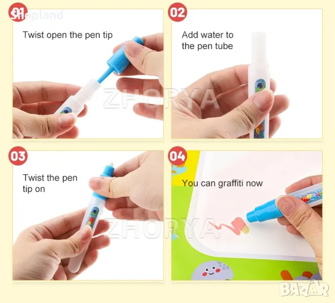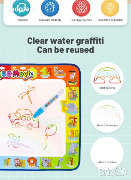 Открийте магията на творчеството с нашето Детско килимче за рисуване с вода – иновативен продукт, който ще разпали въображението на вашето дете без никакъв хаос! Тази удивителна играчка позволява на малчуганите да рисуват, пишат и създават безкрайни шедьоври, използвайки само вода. Без бои, без мастило, и най-хубавото – без петна! Килимчето е изключително лесно за използване: напълнете специалната писалка с вода и започнете да рисувате по килимчето. След няколко минути рисунките ще изчезнат, като предоставят ново пространство за следващи творения. Създадено от висококачествени, безопасни материали, това килимче е идеалният подарък за деца на възраст от 2 + години. Подходящо за използване както у дома, така и в детската градина или навън, то насърчава креативността, като същевременно развива фината моторика и координацията на детето.