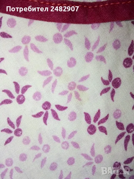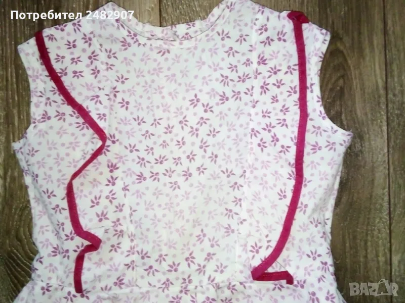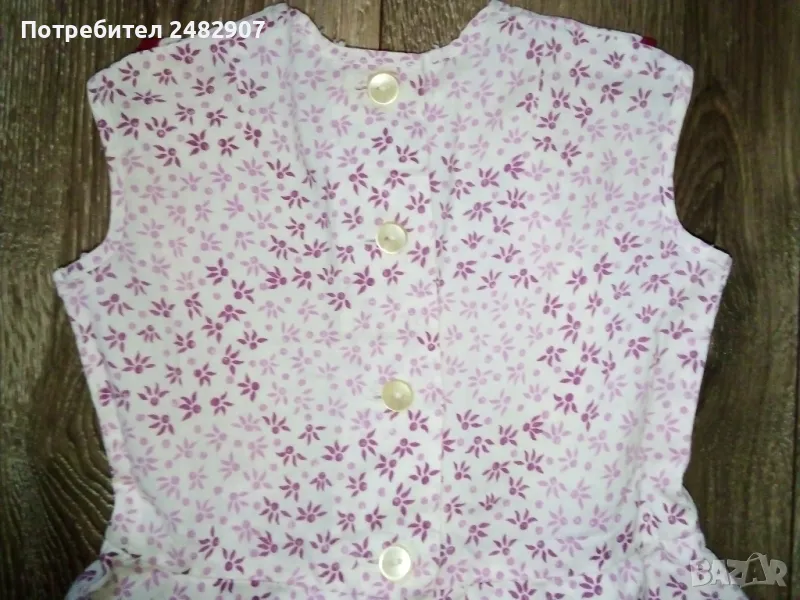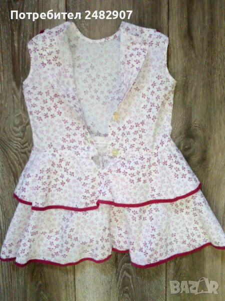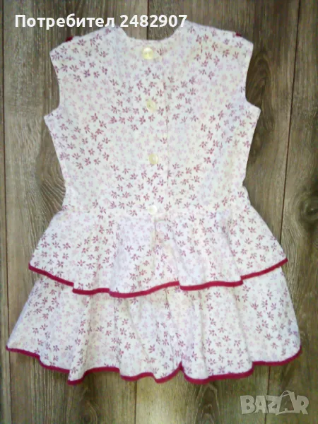 Детска рокля от времето на соца. Ширина в раменете - 26 см, ширина под мишниците - 30 см, ширина в талията - 27 см, ширина в долната част - 65 см, дължина от рамото до долу - 45,5 см. Много запазена, закопчаване - с 4 броя копчета на гърба.