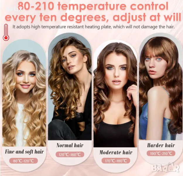 - Работи на всички типове коса: независимо дали искате разпуснати вълни или твърди къдрици, тази преса е идеална за създаване на различни стилове. Машата е подходяща за всички типове коса, включително груба, фина и нормална коса, е чудесен инструмент за създаване на естествени и елегантни къдрици, които издържат цял ден.