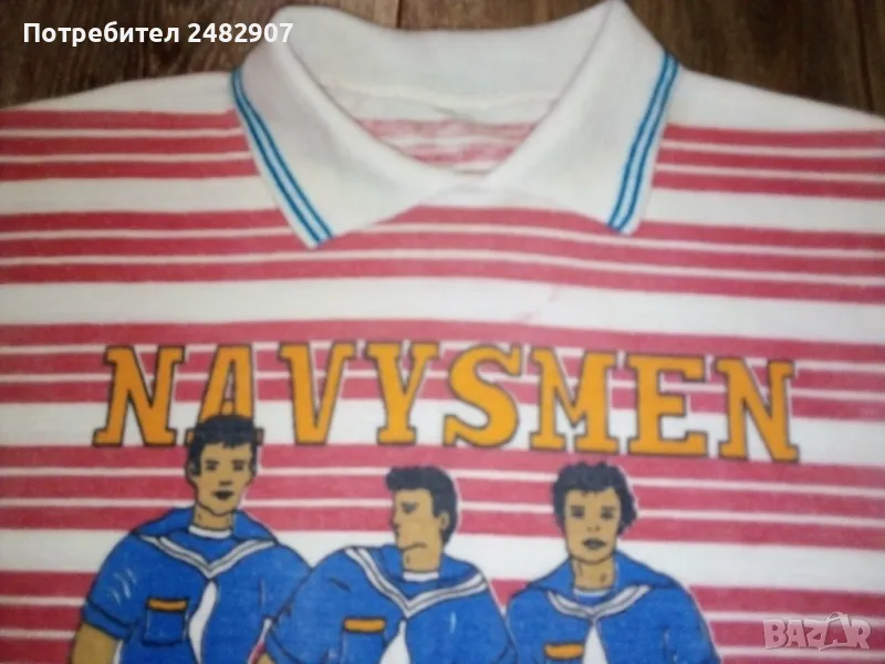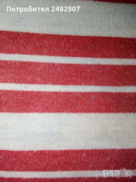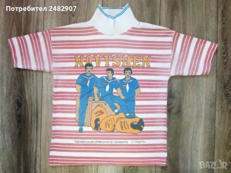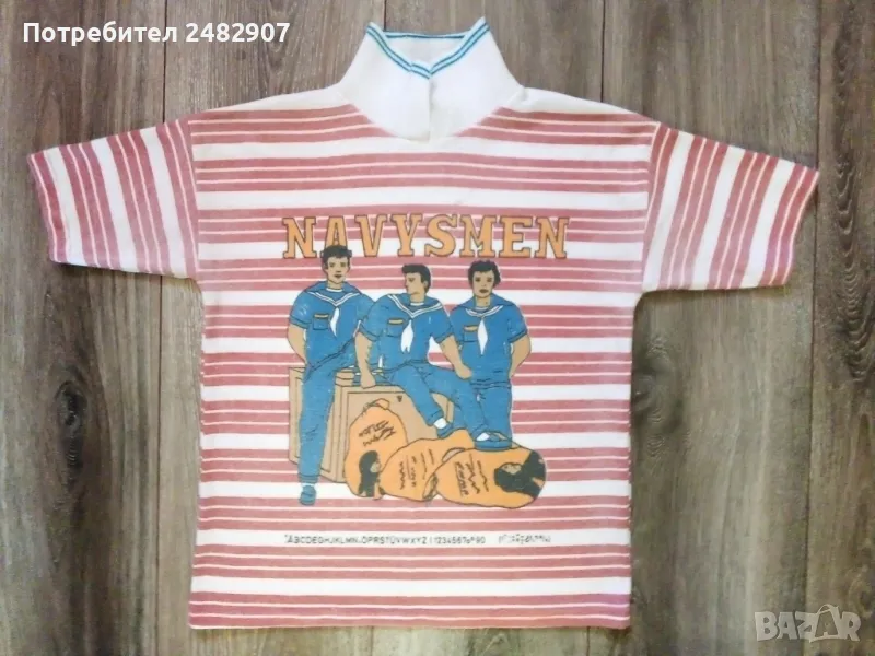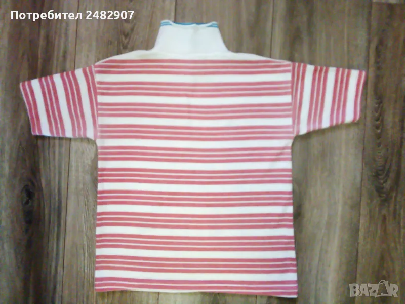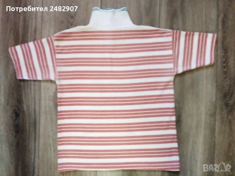 Детска блуза в бяло и червено с къс ръкав, щампа и яка. Ширина в раменете - 42,5 см, ширина под мишниците - 40 см, ширина в долната част - 39 см, дължина от рамото до долу - 49 см, дължина на ръкава от рамото - 15 см, ширина на ръкава в долната част - 11 см. Запазена, с нормални следи от износване.