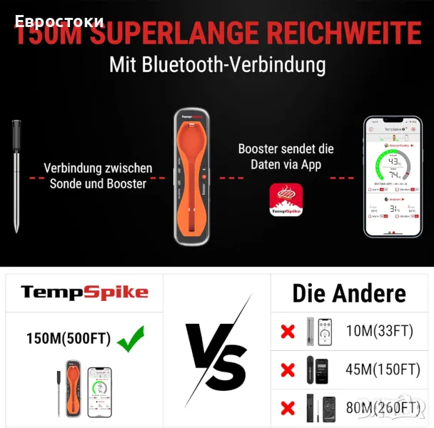 Благодарение на функцията Bluetooth, бустерът предава температурата, измерена от термометъра за скара, на вашето смарт устройство с приложението TempSpike. Без кабел, без бъркотия. Просто изберете вида месо и оптималната температура в сърцевината. Ако температурата бъде превишена, мобилният телефон и бустерът издават звуков сигнал.