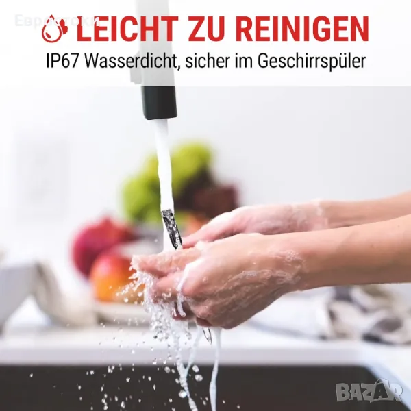 Снабдена с презареждаема Li-батерия, при пълно зареждане термометърът за печене позволява 36 часа употреба. Напълно зареден, бустерът поддържа 3 месеца употреба. Водоустойчивият материал IP67 гарантира, че кухненският термометър може да се почиства под течаща вода или дори в съдомиялна машина след употреба.