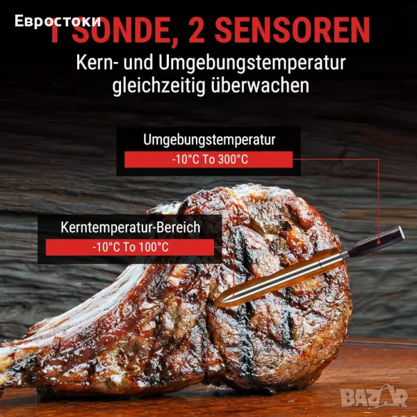 Измервателната сонда има два температурни сензора, един за вътрешността на храната (-10°C–100°C) и един за камерата за готвене (-10°C–300°C). Този измервател на температурата в сърцевината дава измерената стойност (-10°C–100°C) в рамките на 3 секунди с отклонение от ±1°C.