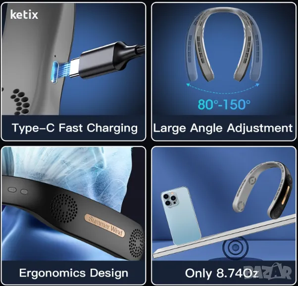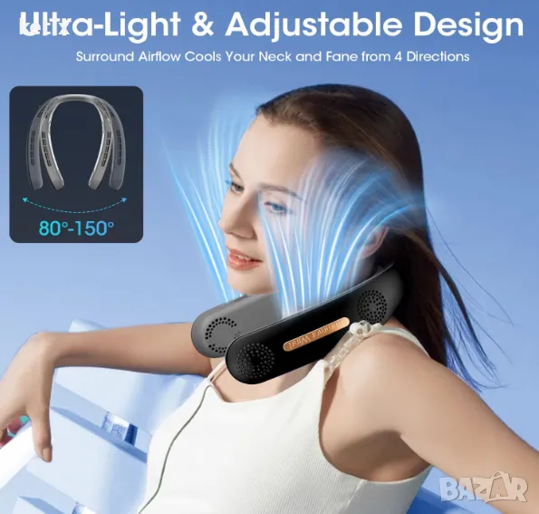- 【Режими с 3 скорости и дизайн без ръце】 Този вентилатор за гърло със свободни ръце е оборудван с 3 регулируеми настройки за обем на въздуха (слаб, естествен, силен). Лесно превключване с независим бутон. Можете да превключите на два или четири турбо мотора в зависимост от вашите нужди. Само 36 изхода за въздушен поток, достатъчни за подаване на 360° заобикалящ охлаждащ въздух. Изключително лек дизайн с тегло 8,74 унции и щадящ кожата ABS материал, диапазон на регулиране на ъгъла 80°~150°, което натоварва по-малко врата. Предоставя ви най-доброто изживяване в тиха и удобна среда.