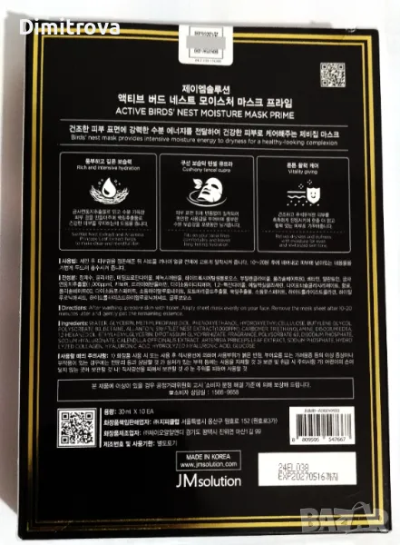 JM Solution Active Birds' Nest Moisture Mask - препоръчват се за интензивна хидратация на лицето, с много голямо количество серум и високо качество на текстилната основа.