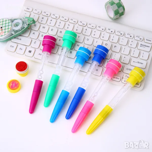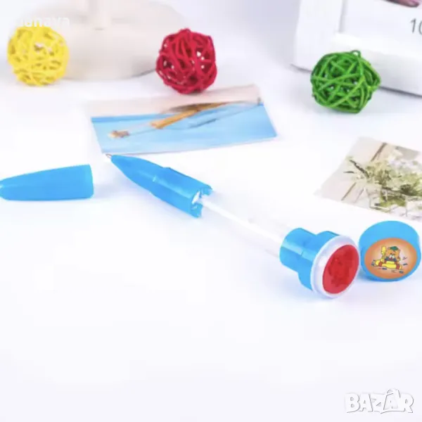 Добавете забавление към вашето ежедневие с тази уникална химикалка! Комбинира практичността на стандартен химикал, креативността на мини печат и радостта от сапунените балончета. Идеален аксесоар за деца, ученици или за малко настроение в офиса.