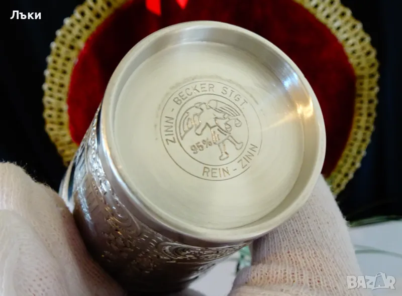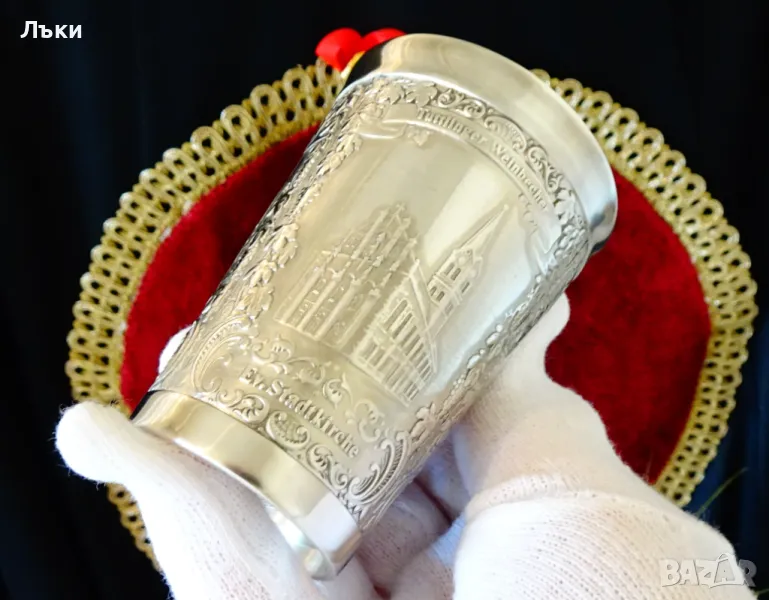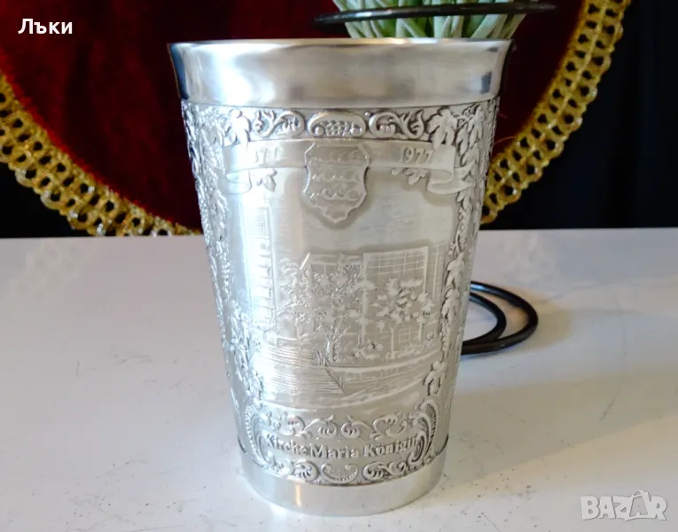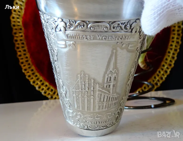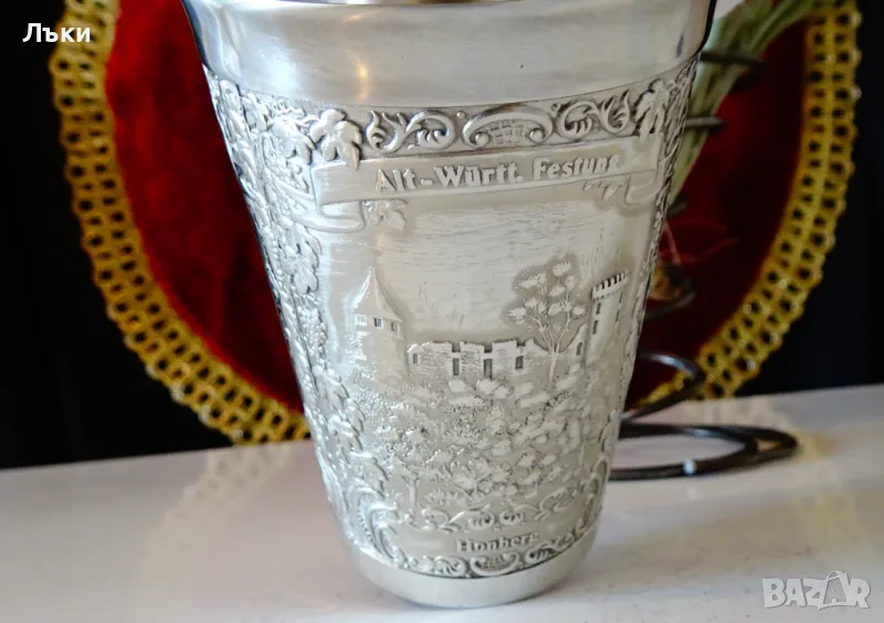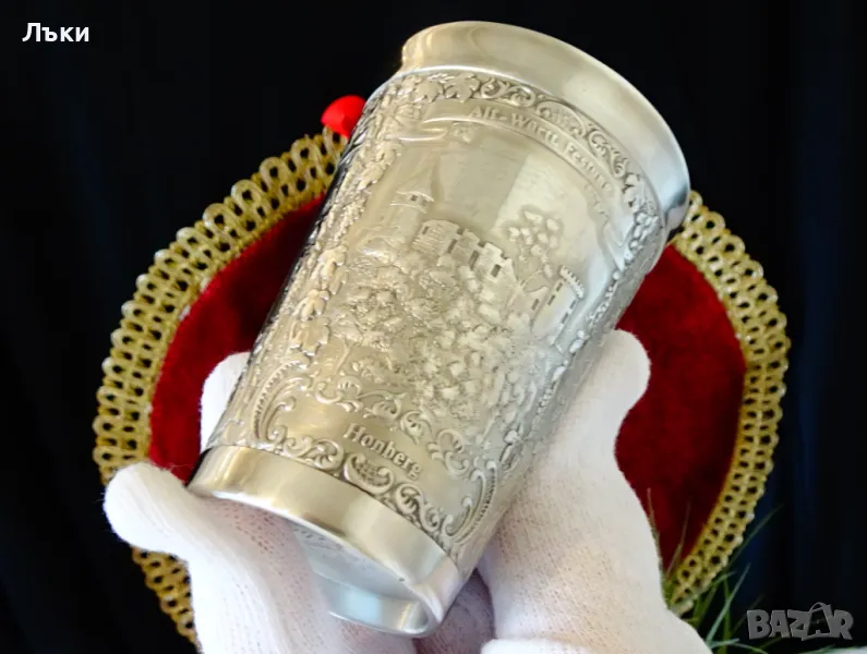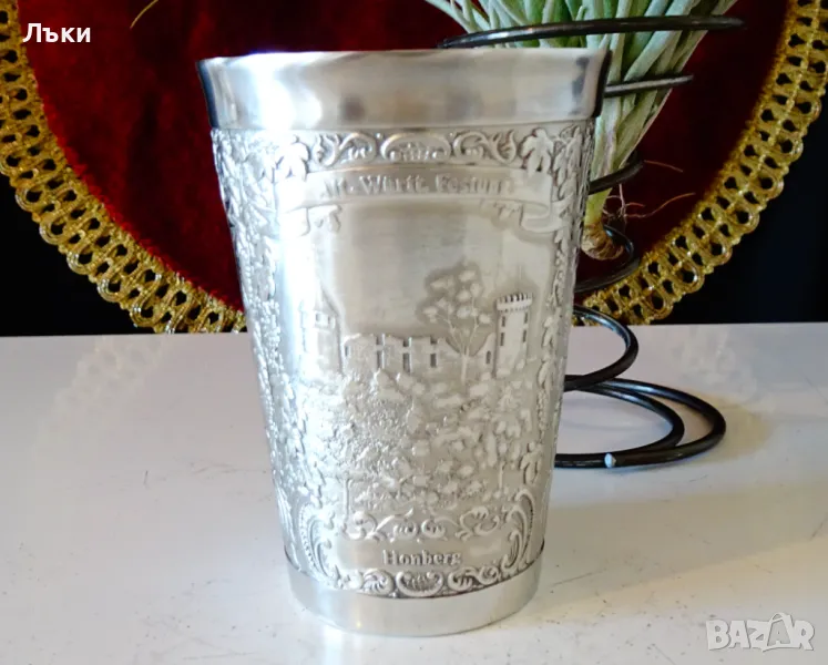 95% калай и 5% сребро,маркирана.Декорирана с релефно гравирани изображения на архитектурни забележителности в Honberg.Картините са разделени от преплетени лози с грозде.Височина 8.5 см.,диаметър 6.5 см.,тегло 160 гр.Вместимост 150 мл.