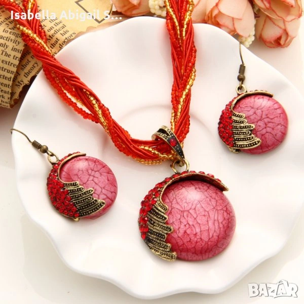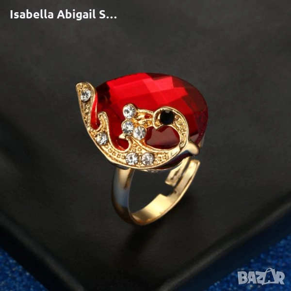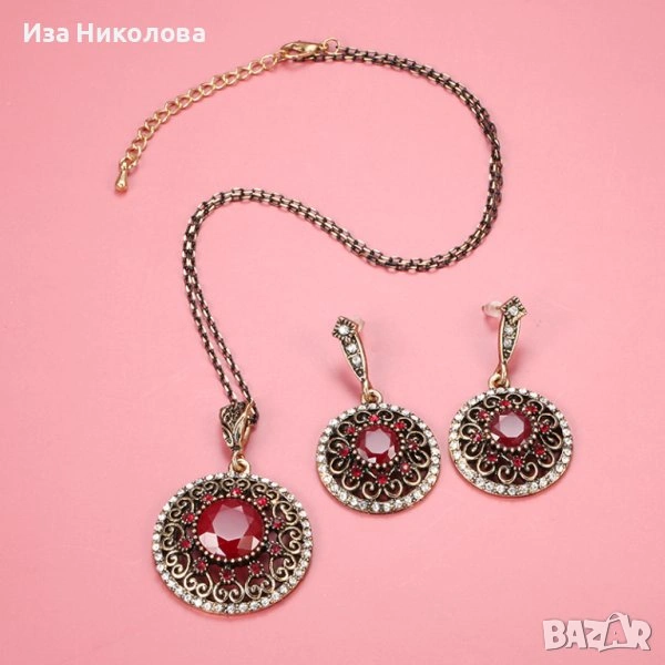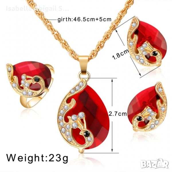 Комплект обици, пръстен и колие, изработени от цинкова сплав в златен цвят, не предизвиква алергии.Камъните са от специална смола, която наподобява рубини.По аксесоарите има пауни с кубични цирконии снимка 13 и 14, цена 12.99 евро