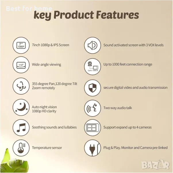 7-инчов IPS екран с резолюция 1080P: Отличният IPS екран на бебефона е по-стабилен от конвенционалния LED екран. Ъгълът на видимост е близо до 180°. Отличният IPS екран може да избегне светкавицата на екрана. При лоши условия на осветление качеството на картината все още е много ясно.