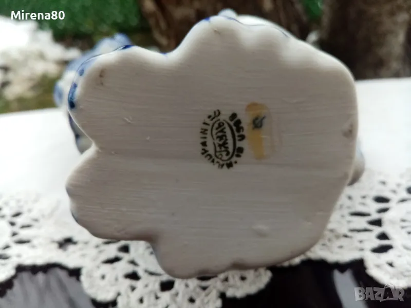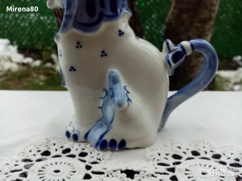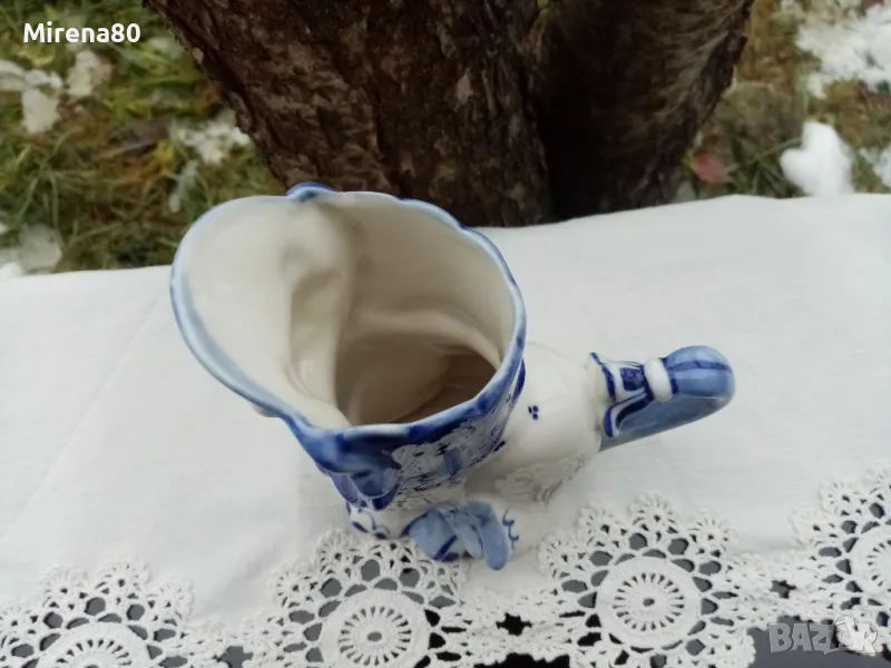 Каничка за мляко, ваза или поставка за прибори - намерих го и в трите варианта по руските сайтове. Кой както намери за добре ! Във всеки случай много красив и впечатляващ съд, характерен за добре познатото руско изкуство. Ръчно рисуван ! Вис. 16, дълж. 13, шир. 8 см. Маркировка, отлично състояние !