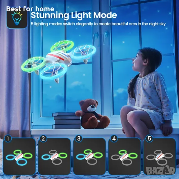 Осветете небето: Ярките СИНИ и ЗЕЛЕНИ LED светлини са монтирани в неговите четири защитни рамки, осигурявайки ви мощен осветителен ефект и ярко изживяване при полет. Пет различни режима на показване на осветлението ще изненадат всеки!!