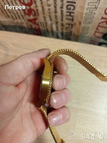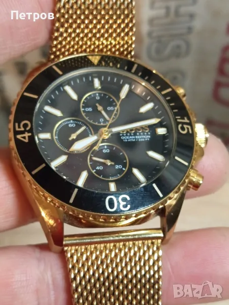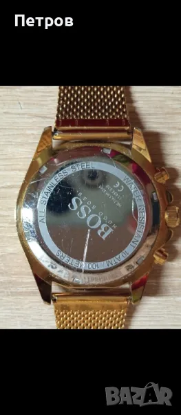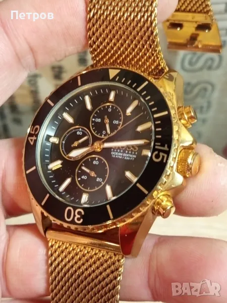 Масивен кварцов часовник.Диам-46мм.Хронограф.Всички функции работят коректно(малките стрелки).Мешово закопчаване,става за всяка китка.Цеят:златист.(gold plated).Водоустойчив 10атм.(капак на винт).Корпус:Неръждаема стомана.Има забележка отстрани на корпуса,цената може да се коментира в рамките на разумното.