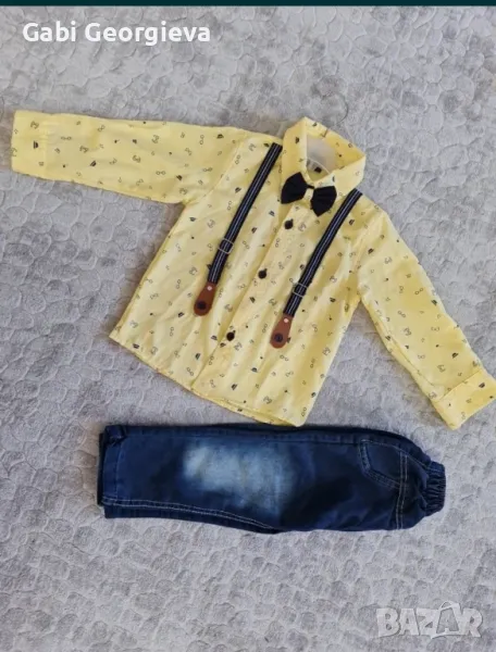 Продавам детски костюм с папийонка , риза и дънки.Облякохме ги за 20 мин.на една коледна фотосесия,така че бих казала,че е нов.По етикет е за 3г. но ние го облякохме на 2 .Така че размера е 2-3.Разгледайте и останалите ми обяви. Пращам с еконт или спиди