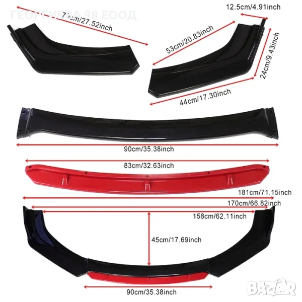 Предна Броня Универсален Лип СпойлерУниверсална добавка за предна броня:Комплекта включва 4 части и крепежни елементи.Предназначена е за всякакви видове автомобили!Високо качество на изработка!Перфектно пасванe.Лесен монтаж, фиксира се чрез залепване или винтове.