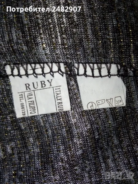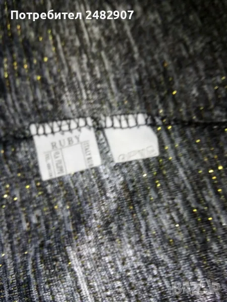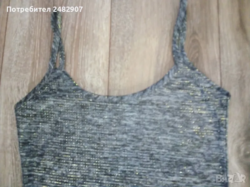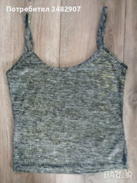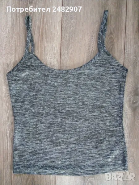 Сив дамски потник с тънки презрамки и блестящ ефект, размер М. Съдържа 100 % полиестер. Ширина под мишниците - 37 см, ширина в долната част - 35,5 см, дължина от горната част на презрамката до долу - 49 см. Много запазен, почти не е използван, полупрозрачен, леко еластичен, без забележки.