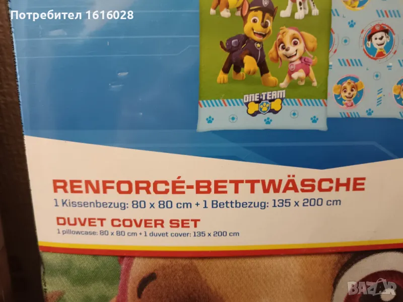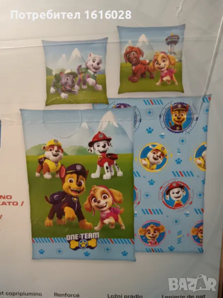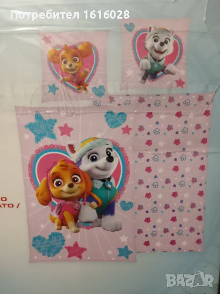 Спалното бельо е двулицево , с героите от Paw Patrol от едната страна и шарки от другата.