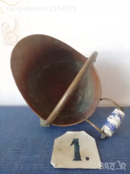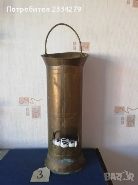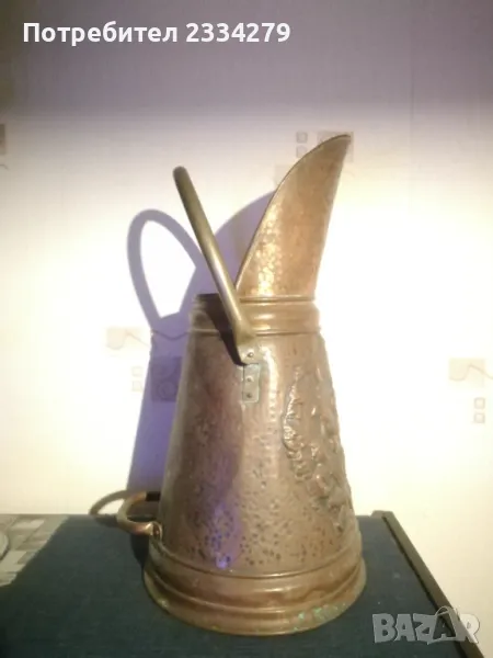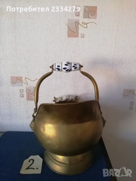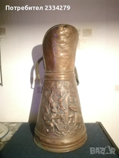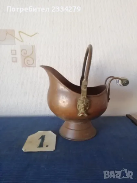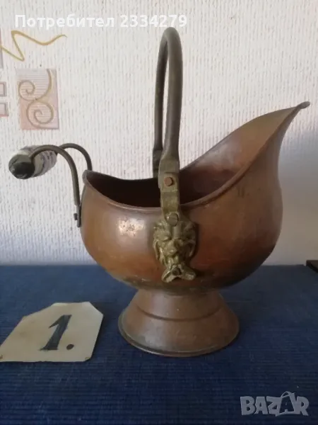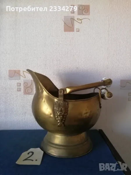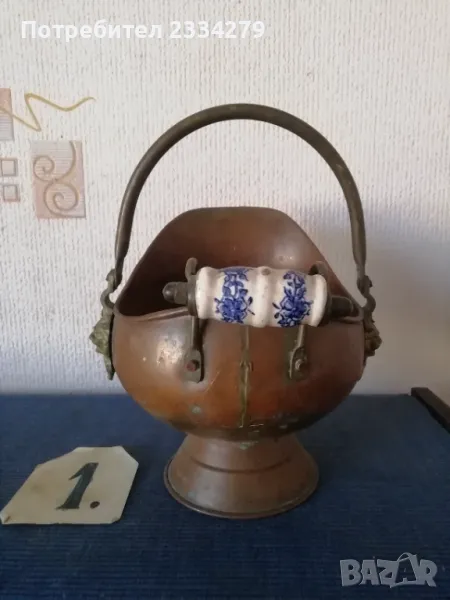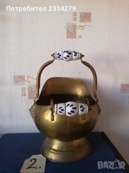 кофи за въглища, пепел и други. N:3 бронзова кофа към камина голяма кофа за въглища, пепел, течности, размери: височина 60см.,широчина 20см.,цена 40€.; N:2 стара Английска бронзова кофа с порцеланови дръжки ,,DELFT" и орнаменти на лъвски глави, използвана за пепел, въглища и течности, автентичен атрибут към камина, размери: височина 39см.,широчина 27см.,дължина 23см.,цена 40€.; N:1 автентична медна кофа за пепел въглища и други, с порцеланови дръжки,ръчно изкована изцяло медна с бронзови орнаменти ,,лъвски глави"с порцеланова дръжка,, DELFT" размери: дължина 22см, широчина 18см.,височина 24см., цена 35€.; N:4 Стара голяма медна кофа за въглища, атрибут към камина, изцяло орнаментирана и с картинен образ, размери: височина 53см.,широчина дъно 30см.,гърло 15см., цена 50€.