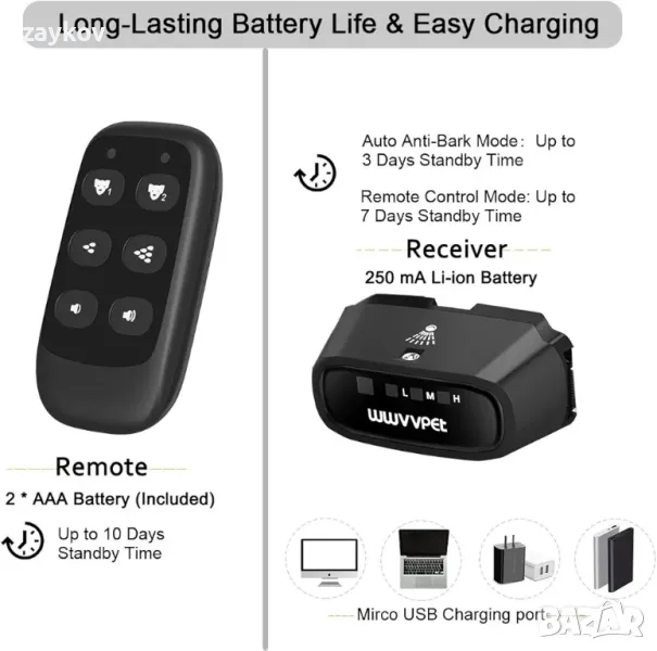 Акумулаторна и устойчива на дъжд: Кучешкият нашийник с формата на спрей с вградена акумулаторна батерия и 2-3 часа време за зареждане ви осигурява до 5-7 дни използване на нашийника (дистанционното управление използва 2 AAA батерии, които са включени). Лекият IPX5 устойчив на дъжд дизайн е само за леко дъждовно време или излагане на мокра трева. (Не го носете при плуване или потапяне във вода)