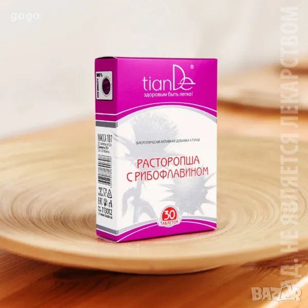 Функционален комплекс „Бял трън и рибофлавин”Функционален комплекс „Бял трън и рибофлавин” се прилага за профилактика и лечение на заболявания на черния дроб. Средство с растителен произход, което има противовъзпалително, антимикробно, жлъчегонно и антиоксидантно действие.„Човек е здрав, докато е здрав черният му дроб”Добавката е обогатена с витамин B2 (рибофлавин), който е един от ключовите витамини необходим за пълноценната работата на черния дроб и неуморно стимулира производството на енергия в клетките, осигурява ефективността на процесите на регенерация и възстановяване на тъканните структури. Не случайно го наричат „двигател на живота”. Препоръчва се още за запазване на здрава и красива кожа, предотвратяване на процеса на стареене. Подпомага за пречистване, защита и възстановяване на разрушените клетки на черния дроб (стимулира синтеза на протеини, доставят структурен материал за изграждане на клетъчните мембрани и др.), за нормализиране на чернодробната функция и обмяната на веществата.Подобрява функцията на панкреаса, има инсулиноподобен ефект.Поддържа функцията на жлъчния мехур, предотвратява причините за образуване на камъни в жлъчния мехур и жлъчните пътища, улеснява функционирането на организма след отстраняване на жлъчния мехур.Подобрява секреторната и двигателната функция на стомаха и червата.Укрепва сърдечно-съдовата система.Има мощен антиоксидантен и имуномодулиращ ефект, стимулира собствената антиоксидантна система на организма.ПРИЛОЖЕНИЕЗа възрастни по една таблетка веднъж дневно по време на хранене. Минималният курс на лечение е 3-4 седмици. По препоръка на специалист, дозата може да бъде увеличена до 2 таблетки дневно.АКТИВНИ СЪСТАВКИЕкстракт от бял трън – от това растение се извлича силимарин, единственото вещество, за което се смята, че може да оживи чернодробните клетки. Силимаринът има уникално действие върху клетките на черния дроб: освобождава (изчиства) чернодробните клетки от натрупаните вредни вещества, променя клетъчна мембрана, така че дори най-опасните отрови не могат да проникнат вътре, стимулира възстановяването на разрушените клетки на черния дроб. Флавоноидите на белия трън са уникални природни антиоксиданти, които оказват 10 пъти по-висока активност в сравнение с витамин Е и предпазват клетките от разрушаване не само на черния дроб, но и на други органи и системи.Рибофлавин (витамин B2) – участва в производството на червените кръвни телца и по този начин съдейства за движението на кислородните молекули в кръвта, засилва функциите на имунната система и помага на организма в борбата с различни болести и вируси. Заедно с други вещества подпомага усвояването на белтъчините и на енергията, отделяна при разграждането на въглехидратите. Улеснява и работата на отделителната система, с което е от полза за дебелото черво. Витамин В2 има значение и за растежа и развитието на организма, както и за възпроизводствените му функции. Не на последно място поддържа кожата и косата здрава, а ноктите – твърди. Рибофлавинът намалява главоболието и увеличава нивото на усвояемост на желязото в организма като с това си свойство е много полезен при хора, страдащи от желязонедоимъчна анемия. Той функционира като част от група ензими, които участват в метаболизма на въглехидратите, мазнините 