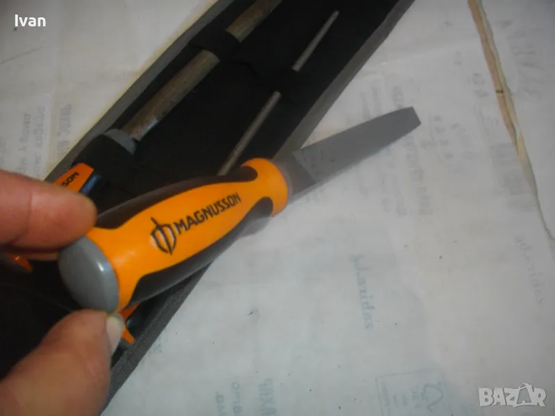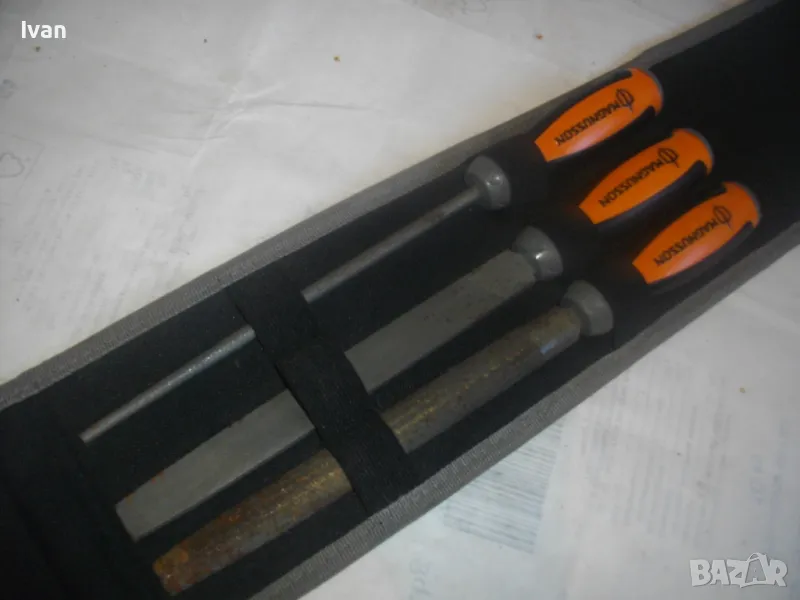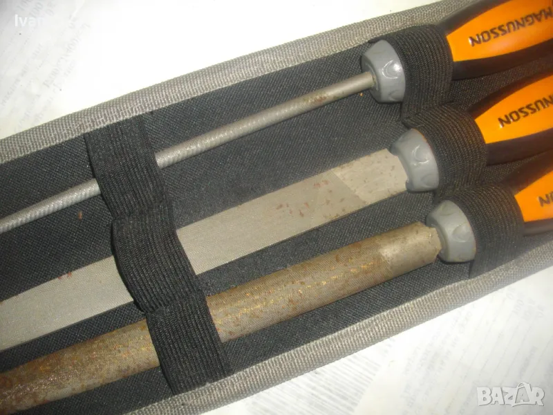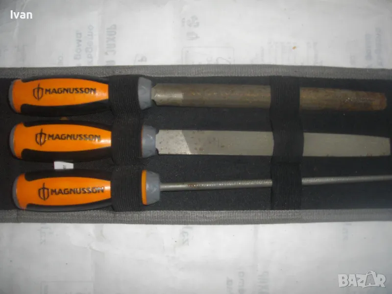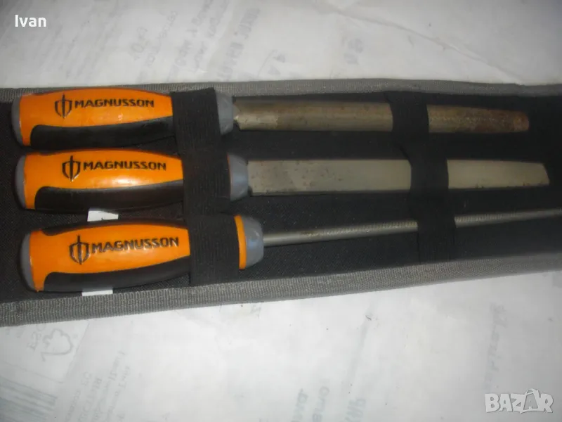 ОПИСАНИЕ на шведкски 3 бр. нови пили в несесер черен. Цена 129 лв за комплекта. Шведско произовдство и марка висок клас. Марка на несесера и на пилите - MAGNUSSON. Несесер - черен здрав плат полиестер, със здраво и стабилно велкро закопчаване/залепяне. Размер несесер сгънат/закопчан - 33 см х 14 см. Пили - всичките са с дължина цялостна 32 см, работна дължина - 20 см. Обла - ф 4мм, полуобла - ширина 22 мм, права - ширина 20 мм. Дръжки - твърда гума с логото на марката. Комплектът е нов, неизползван и неупотребяван.