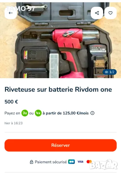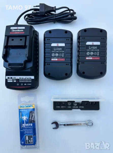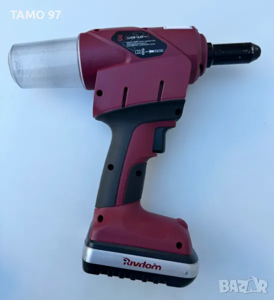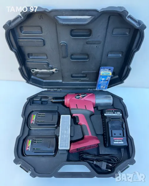 Продавам професионална акумулаторна нитачка на Rivdom One. Машината е като нова, както се вижда и на снимките почти без никакви следи от използването също така работи брилянтно. Оригинално немско производство, внос от Франция. Комплекта включва машината, 2 броя литиево-йонни батерии по 14.4V, ключ за смяна накрайници, накрайници за различни размери нитове, кутия с нитове, зарядно устройство и оригинален куфар. Пращаме с опция преглед и тест с куриерска фирма еконт може и лично предаване за гр. Шумен.