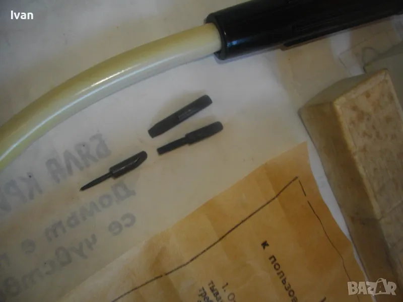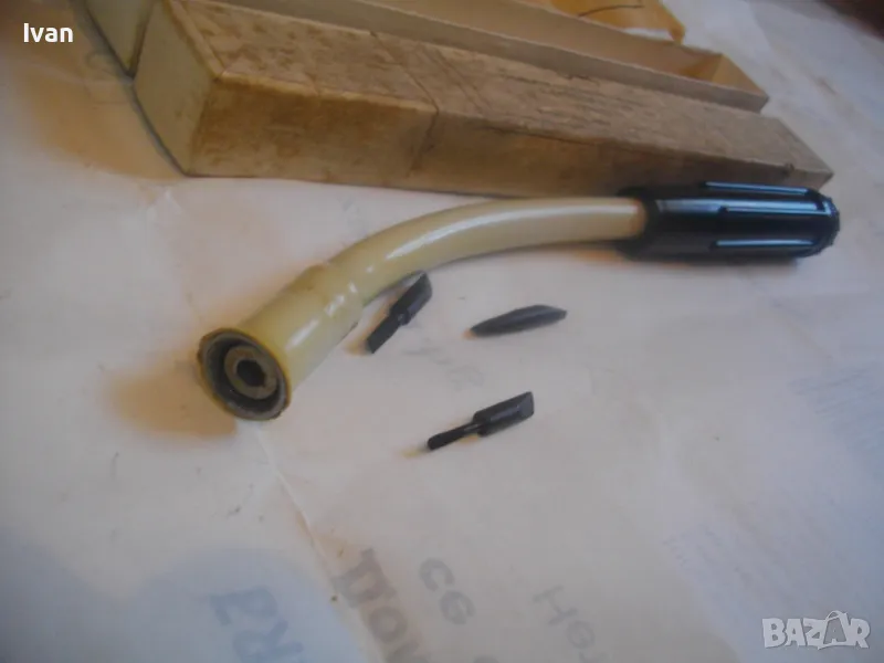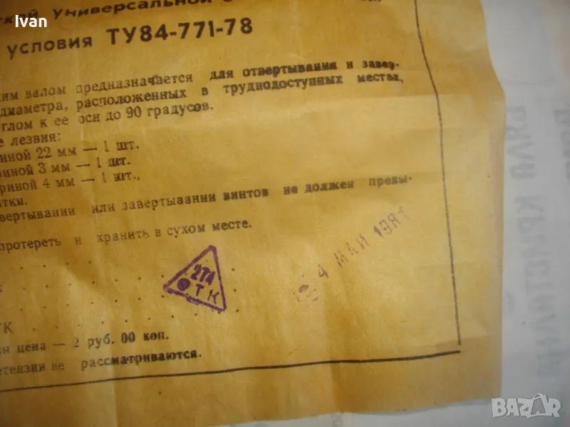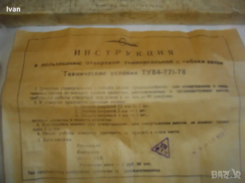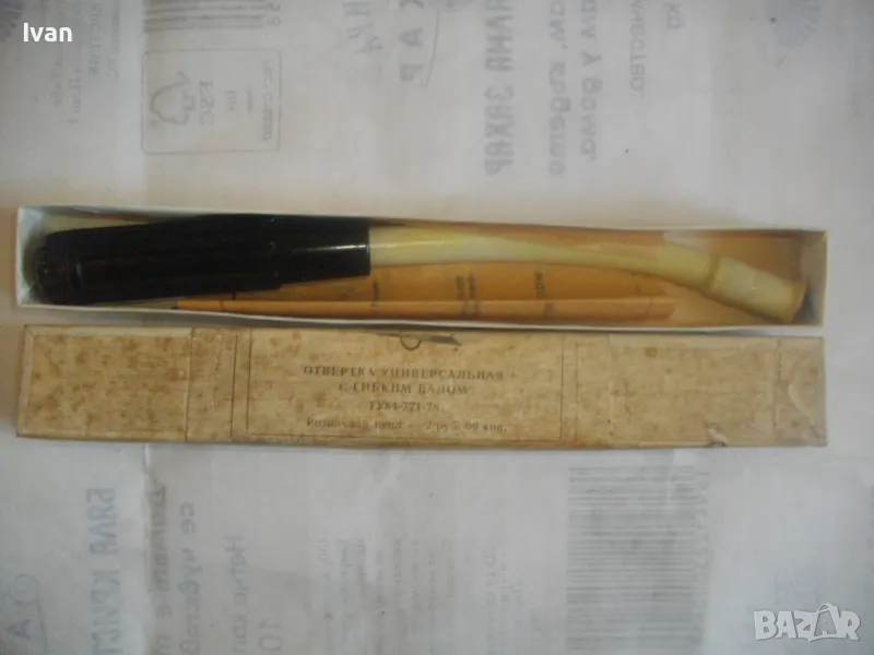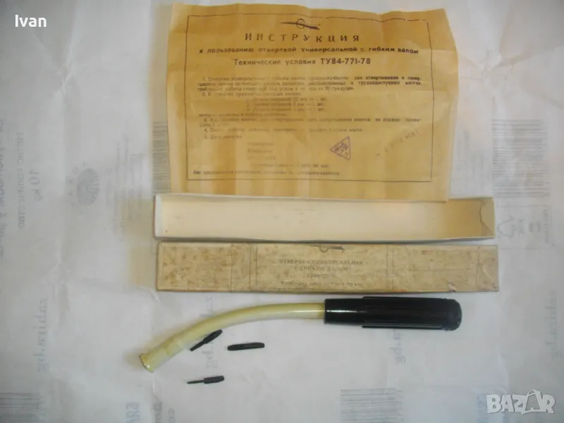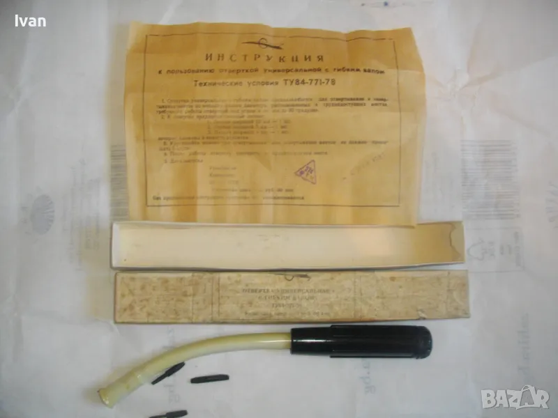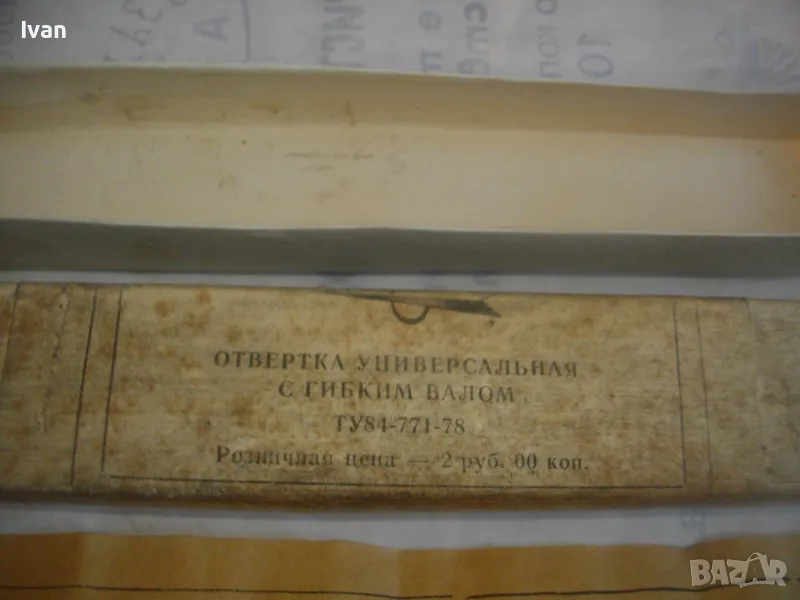 Отвертка ръчна пълен комплект руска/СССР с гъвкал вал рамо за работа в труднодостъпни места - в оригиналната си кутия - цена 159 лв. За колекции, интериор, като музеен експонат и работа по предназначение. Съвсем нова, неизползвана, с пълния си оригинален съветски комплект. Марка и модел - Отвертка Универсальная с гибком валом ТУ84-771-78. Стандарт 1978 г. Дължина на инструмента 240 мм, бакелит твърда дръжка черна, винтова капачка с вградено място за накрайниците. Накрайници - къси, различни 3 бр, от закалена инструментална стомана. Гъвкавия вал е пружинен, с покритие твърдо масивно бяло дебело найлоново покритие. Глава захват - ф 4мм. Налична е оригиналната листовка с описание на комплекта и инструкции за употреба, от оризова хартия , към инструмента в кутията.
