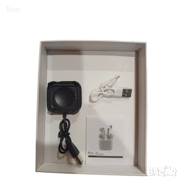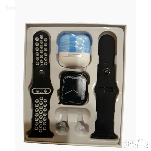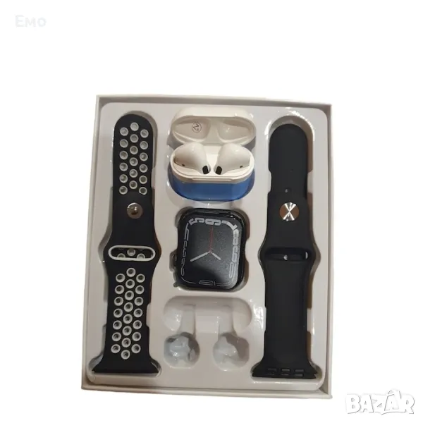 Комплектът включва часовник, каишки, слушалки, кабел и кутия.