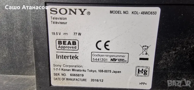 SONY KDL-48WD650 с счупена матрица ,1-980-335-22 ,RE243ZP ,1-458-900-11 ,1-980-483-11 ,LB48009 V0_03 → Обява 48564016