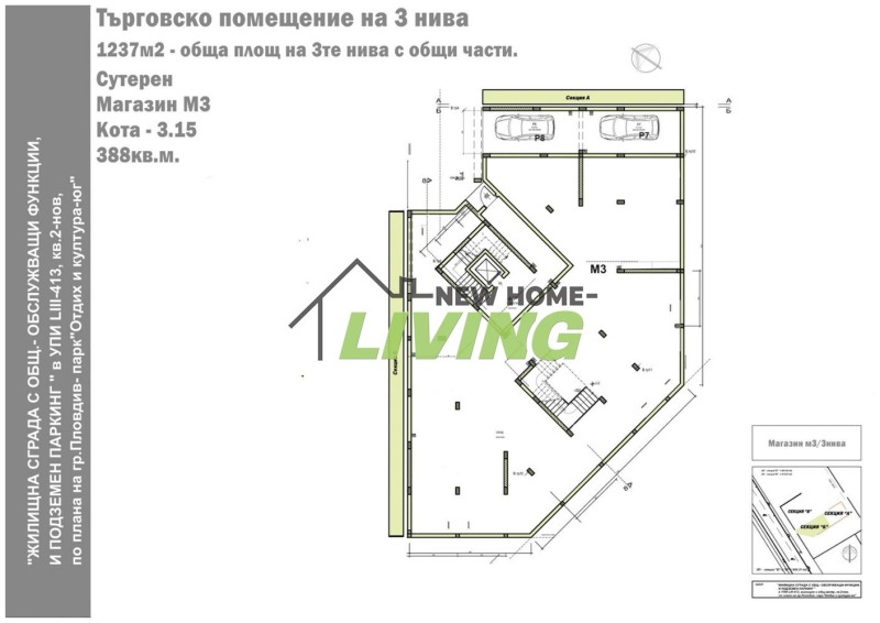 МАГАЗИН с обща застроена площ от 1237 кв.м. Разпределен в три нива. Площ без общи части: сутерен - 388; I ет. - 276 кв.м; II ет. - 452,40 кв.м. Обектът е с разрешение за ползване като Магазин в момента, но при Ваш интерес подлежи и на преустройство. 47.3KW мощност на обектът. Идеален за голям ресторант, медицински център, хранителен/мебелен магазин,