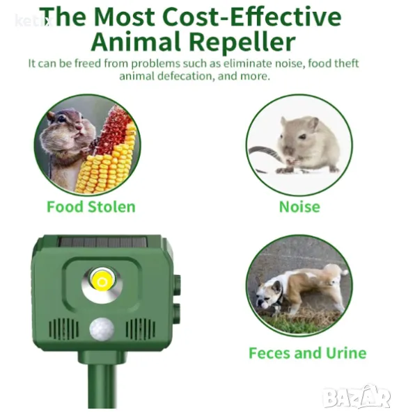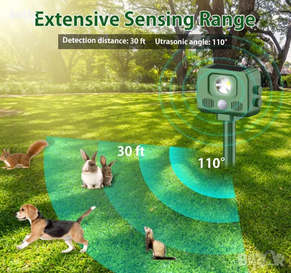 【Широк обхват на контрол】: Репелентът за животни работи при 13-32kHZ, работният обхват е 8-9 метра, сензорът за движение може да покрие диапазон от 110°, което може ефективно да прогони нахлулите малки животни, можете да го използвате в дворове, градини, ферми, водоеми и други места