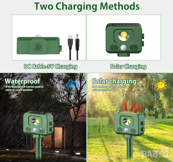 【Захранван от слънчева енергия и водоустойчив】: Горната част на ултразвуковия репелент за животни е снабдена със слънчев панел, който може да се зарежда от слънчева енергия или с помощта на кабел за данни. Капацитетът на батерията е 1500mAh и може да работи дълго време дори в облачни дни. Водоустойчивият дизайн позволява устройството да се използва при дъжд и сняг