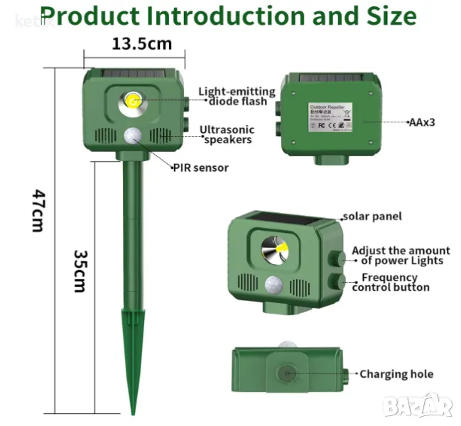 【Лесен за използване】: Просто трябва да поставите репелента за животни върху зоната, която искате да защитите, уверете се, че стърчи на поне 12 см от земята, внимавайте да не блокирате слънчевия панел.Можете също да го използвате, когато отивате на къмпинг, за да избегнете безпокойството на дивите животни.