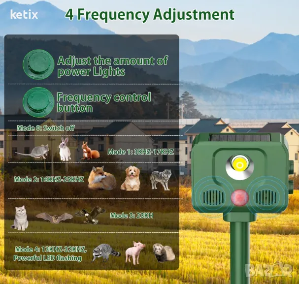 【Безопасни и безвредни】: Ултразвуковите вълни, излъчвани от репелента за животни, няма да навредят на вас и вашите домашни любимци, когато режимът на настройка е режим 1, режим 2, режим 4, звукът на репелента за животни може да бъде чут и от хората, затова е препоръчително да държите репелента за животни далеч от спалнята, за да не повлияе на останалите