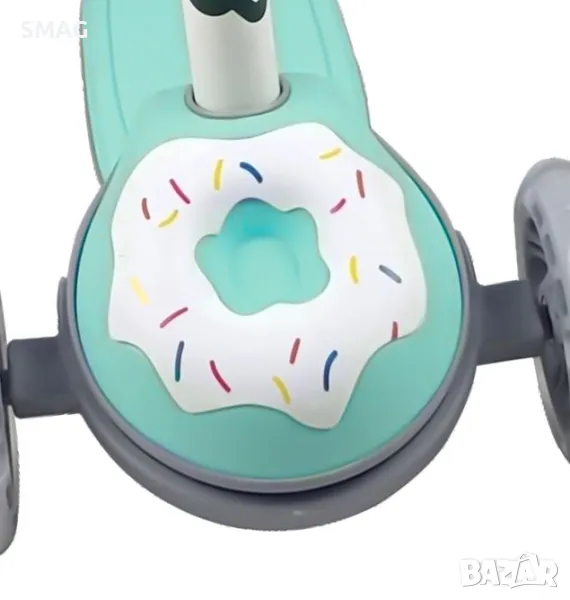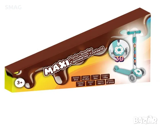 Метална тротинетка с пластмасови части в цвят верман с 3D дизайн на поничка. Има 3 колела с LED светлина (не работи на батерии). Има спирачка на задното колело за безопасно спиране на детето. Воланът (сгъваем) е със здрави дръжки за по-голямо удобство и може да се регулира на 3 височини в зависимост от ръста на детето (63-72-78-85см от таблата). Има 118x28mm ABEC-9 PU колела. Тротинетката завива чрез накланяне на тялото на водача надясно или наляво. Не се изисква сглобяване. Просто поставете волана върху таблата.