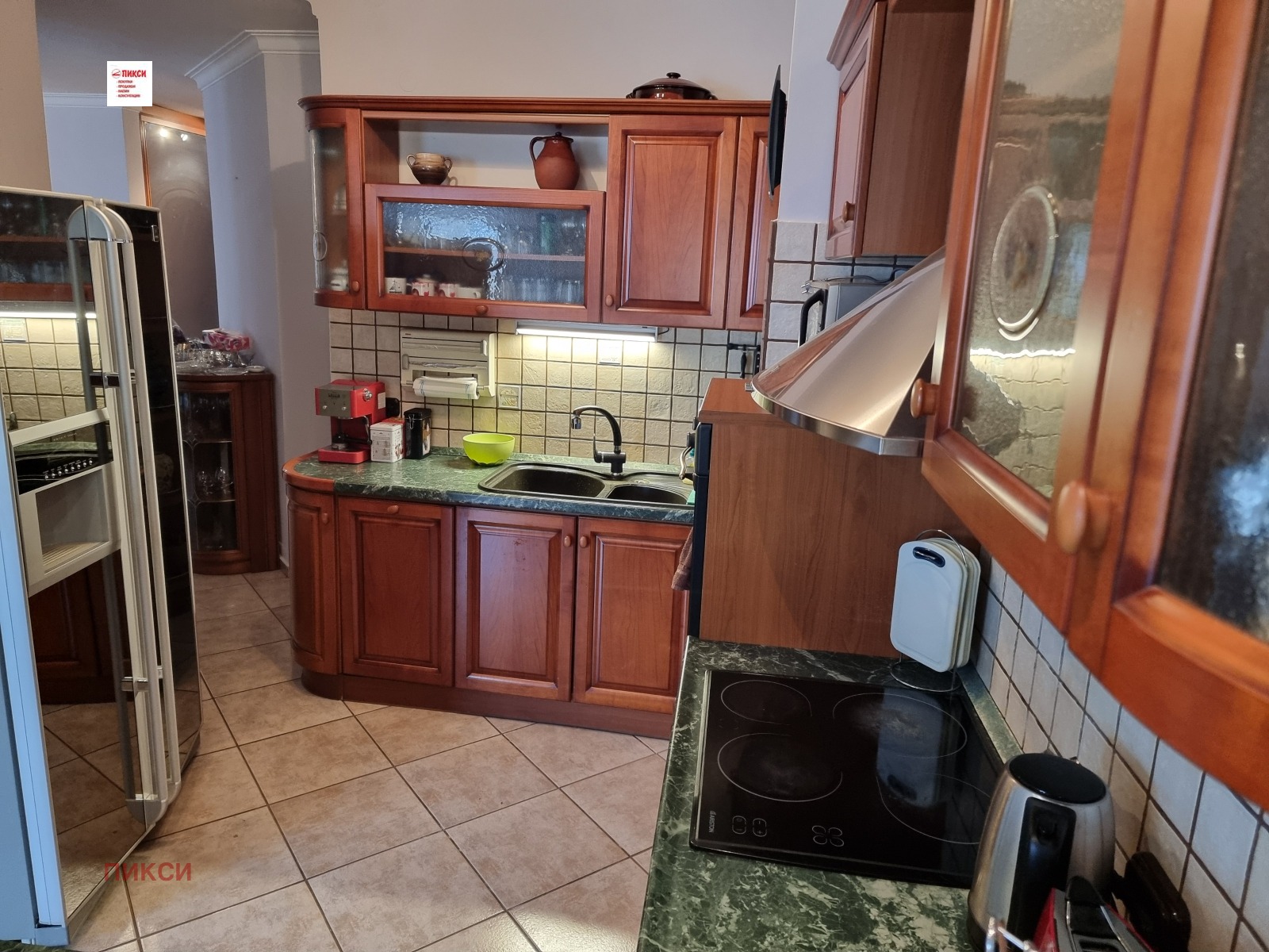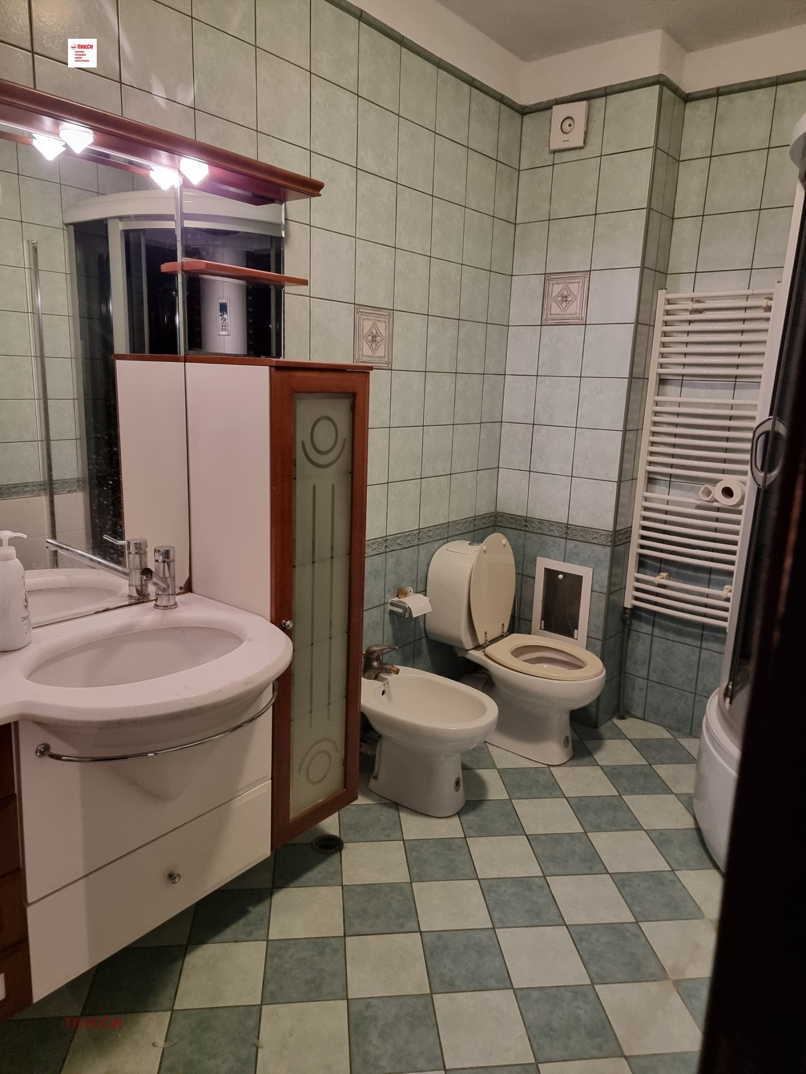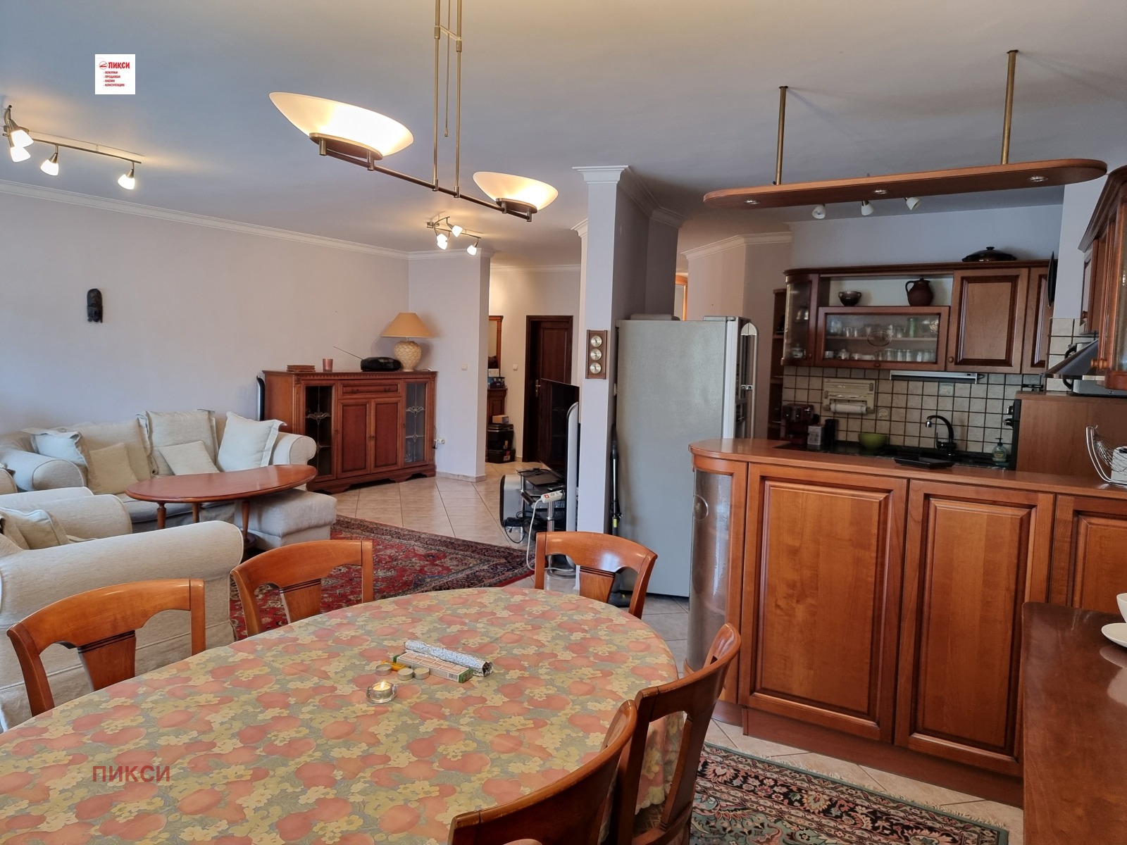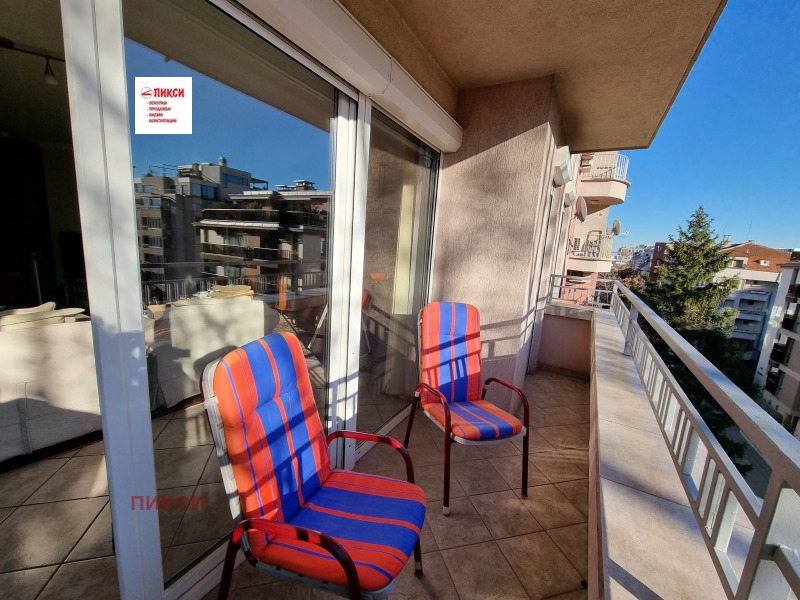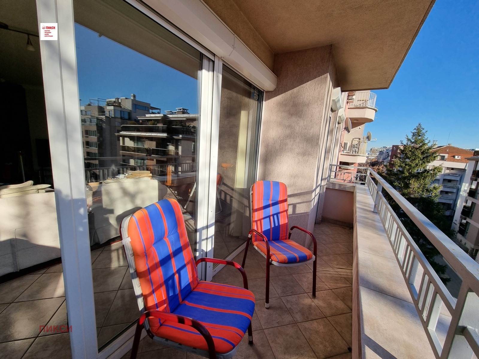 The apartment is near Kozyak Street and Rusaliyski Prohod Street, right next to the South Park. Layout: spacious large living room with dining room and kitchenette and terrace of about 50 sq.m. with southern exposure, two large bedrooms with a shared terrace, bathroom with toilet, second toilet with shower, laundry room. Fully furnished with custom-made furniture and complete equipment of all necessary electrical appliances. Heating and air conditioning. New building with luxurious common areas.