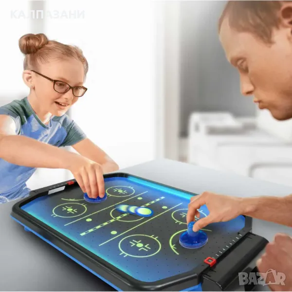 Пренеси тръпката и вълнението от аркадните игри у дома с играта Arcade Air Hockey! Години наред въздушният хокей завладява посетители на аркадни игри от всички възрасти, тъй като шайбата се плъзга и отскача по повърхността на масата с невероятни скорости. Този комплект предлага цялото забавление в компактен комплект! Точно като аркадната версия, трябва да чукнеш шайбата във вратата на опонента си. Включи машината, за да започне въздушният поток и виж как шайбата започва магически да се рее около игралната повърхност. Предизвикай приятел и започнете своята игра! Кой ще успее първи да вкара 9 гола и да спечели?
