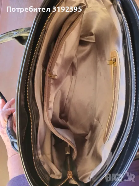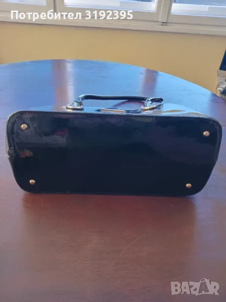 съвсем нова Дамска чанта от черен лак с дължина 37 см, височина - 26 см и статично дъно със широчина 17 см. Отвътре в едната страна има страничен джоб със цип за документи, а от другата страна кожен джоб за GSM. Има и средна преграда със цип.