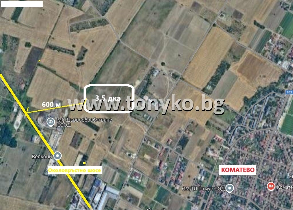Реф. 631349;'ТОНИКО имоти' предлага парцел 3500 кв.м. между Околовръстно шосе и 'Коматево'. Намира се на около 600 м от шосето и на около 750 м от кв. 'Коматево', местност 'Терзиите'. Имотът има лице 40 м към полски път. Съгласно Общия устройствен план попада в устройствена зона 'Жм2' за ниско жилищно строителство с устройствени показатели: Плътност до 40 %, Кинт 0,8. Разгъната застроена площ около 2200 кв.м. Смяната на статута струва около 3 евро/кв.м. За контакт: Антоанета Ненова 0898 613 555