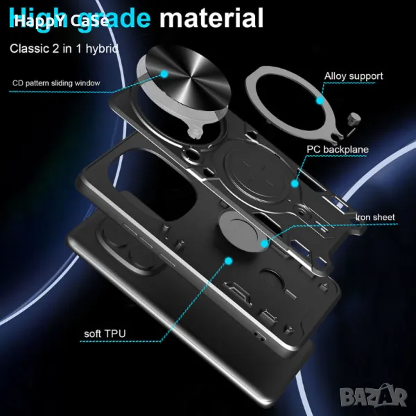 4. Голям метален пръстен отзад на гърба. Служи като стойка на която телефона може да се обляга в хоризонтално и вертикално положение. Също пръстена може да се използва и като finger holder за сигурно захващане на телефона с един пръст. За по-голямо удобство, пръстена може да се завърта на 360 градуса.