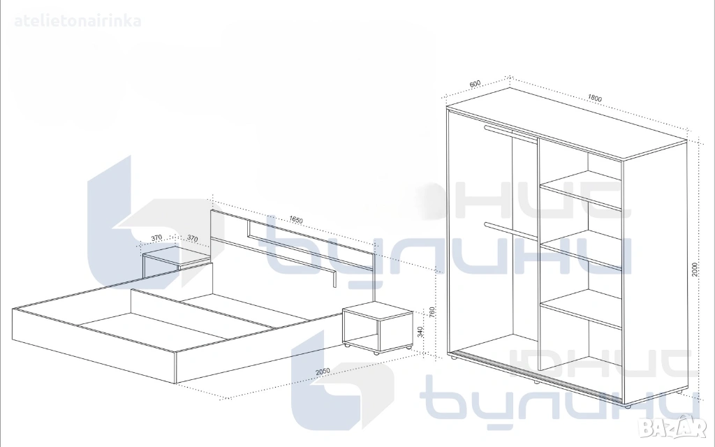 Размери: спалня с нощни шкафчета: 239/ 205/ Н76 см;
