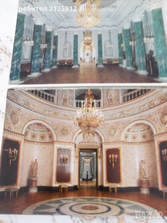 1.Комплект от 16 картички, представящи залите на Петродвореца, Петербург с текст на английски и руски език.