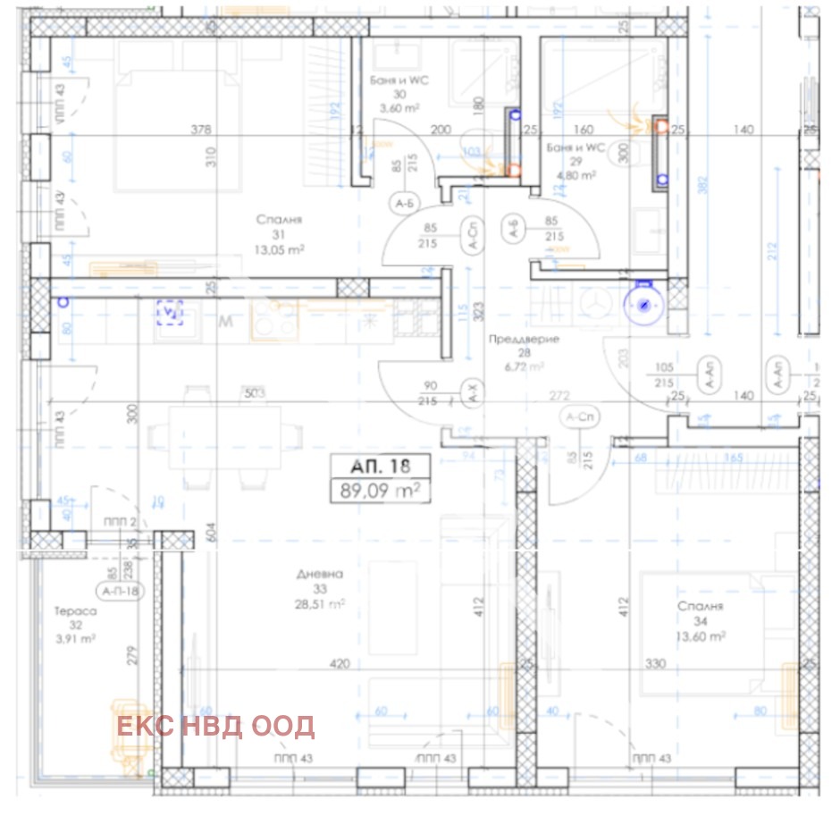 РАЗПРЕДЕЛЕНИЕ: Жилището разполага с площ от 105 кв.м. разпределена по следния начин: предверие, дневна с трапезария и кухня, две спални, две бани с тоалетна и тераса