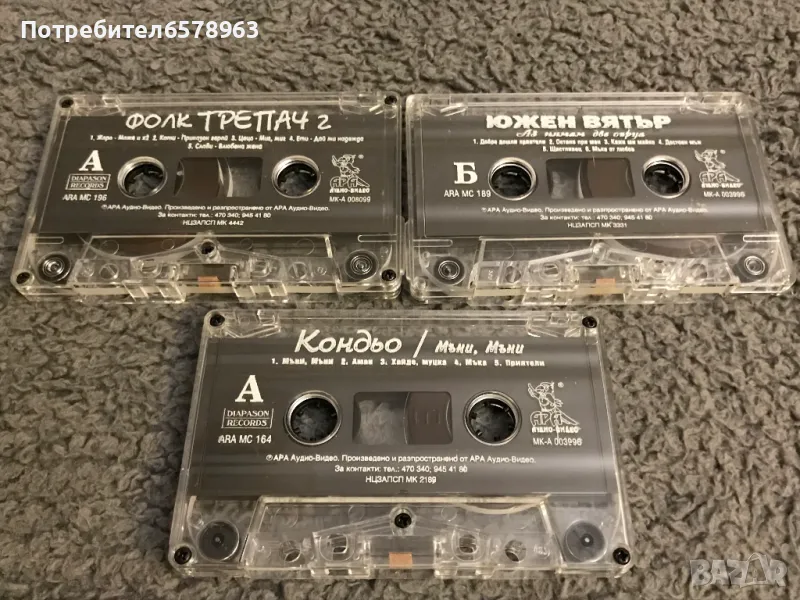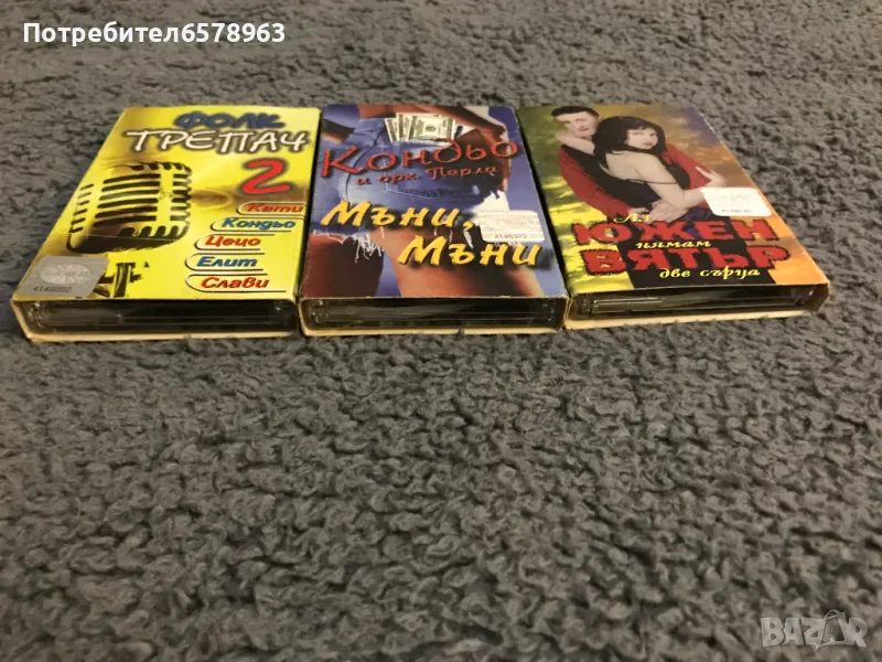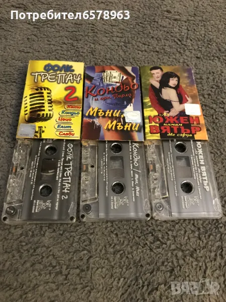 Продавам оригинални и много запазени аудио-касети . Касетките са в много удобни хартиени '' кутийки '' , който са много по-леки от досадните чупливи пластмасови кутийки . Касетките не се изхлузват от '' кутийките '' Фолк Трепач 2 - Кондьо - Мъни , Мъни и Южен Вятър . Цена 5 евро за брой или трите за 10 евро . Изпрашам с Еконт или Спиди .