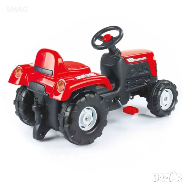 Превозно средство с крачно задвижване, червен трактор с предна ос и клаксон (задвижван от помпа под налягане).